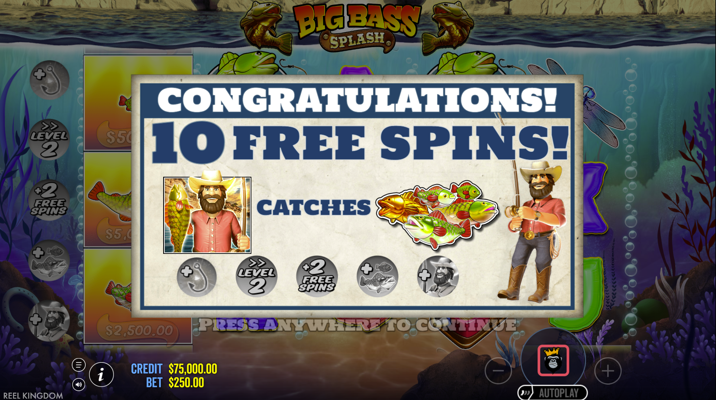 - Sticky Fisherman Wild: During free spins, Fisherman Wild sticks to reel 5 for guaranteed collections